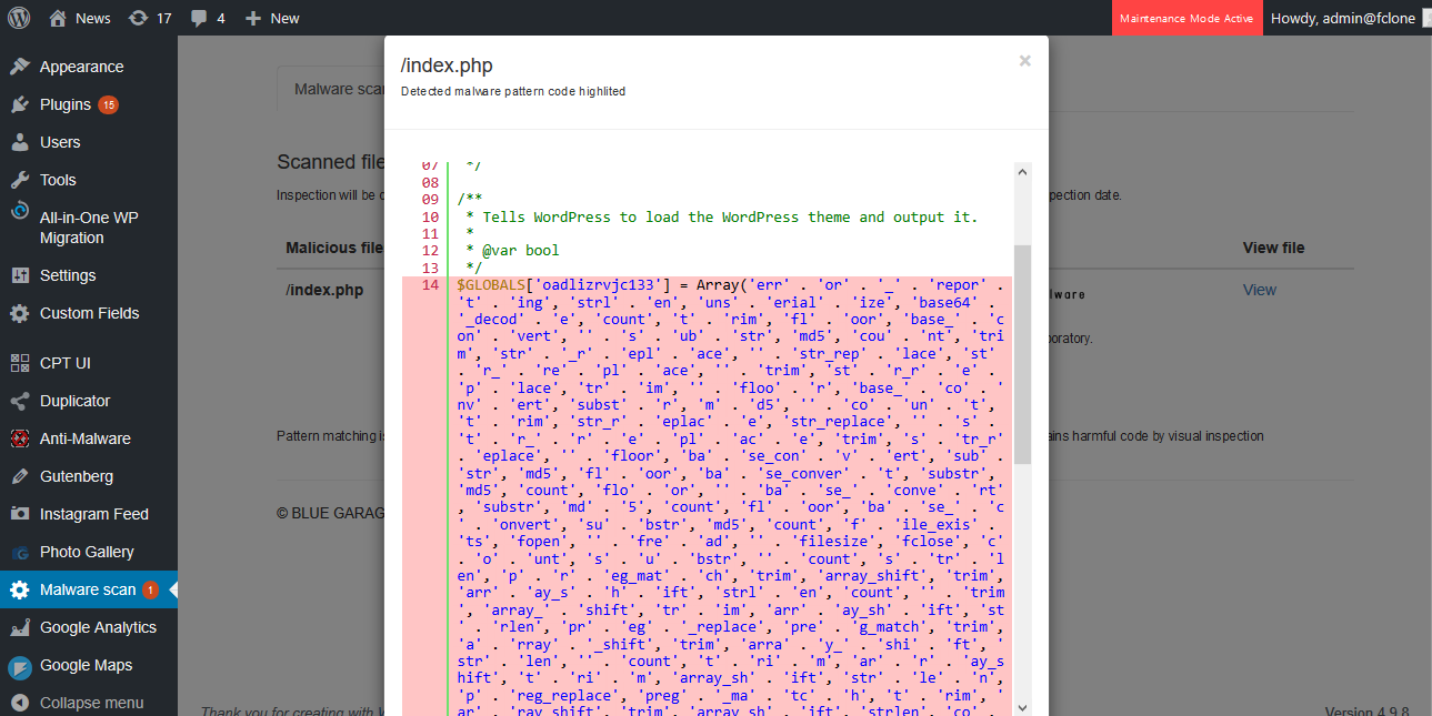 Wanneer WordPress gekaapt is, kun je de locatie van de malware code en de plaats van het geknoeide bestand controleren.