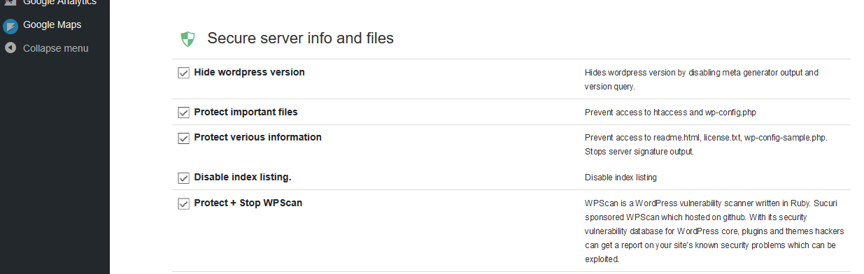 Schakelt de toegang tot htaccess en wp-config.php bestand uit en beschermt deze.